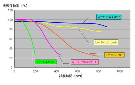 スーパームキコートは、他の塗料に比べて、屋外で風雨による変形・変色・劣化等の等の変質に耐する強さ、(= 耐候性)が驚くほど高く、時間が経過しても塗装した時の光沢がほとんど落ちません。