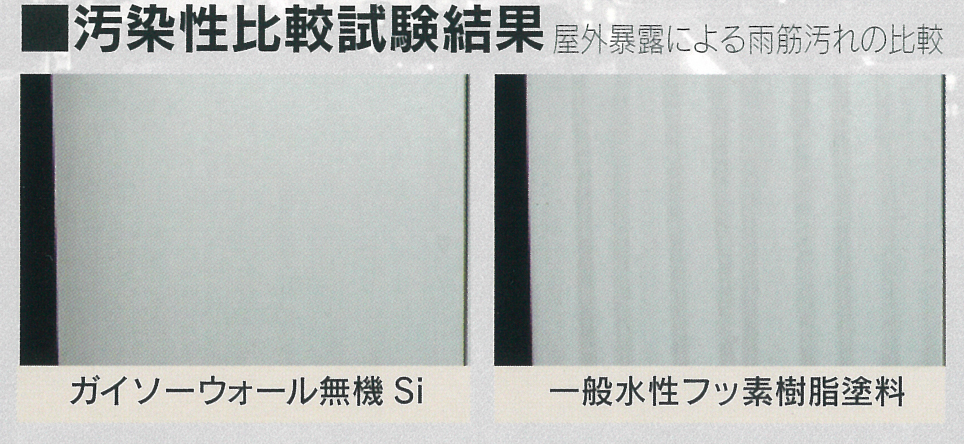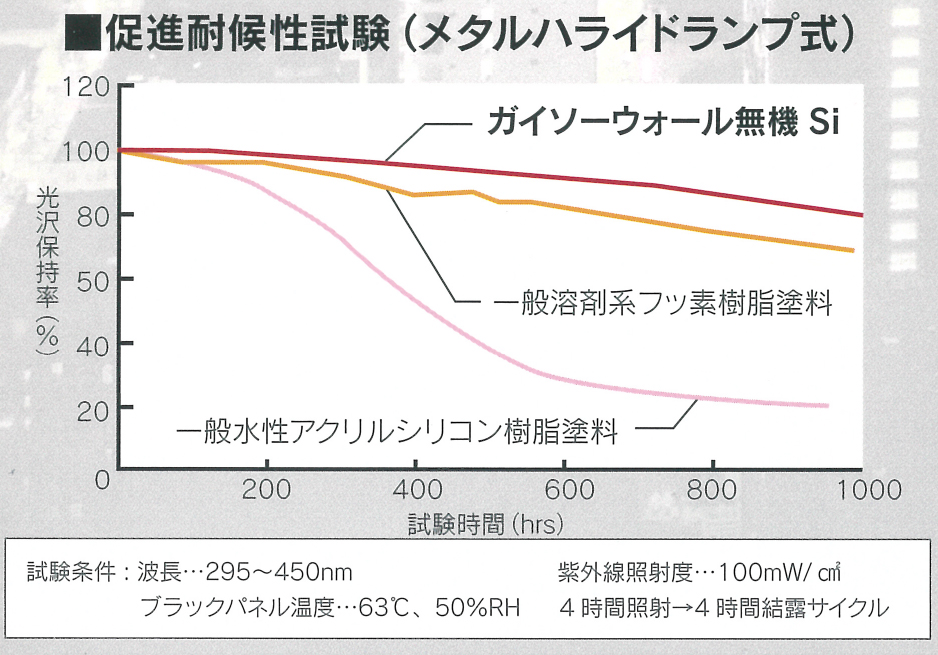 ガイソーウォール無機Siは、科学的に安定したポリシロキサンを形成する無機質ポリマーを主成分としているため、紫外線や熱に起因する劣化に強く、耐候性に優れています。フッ素樹脂塗料をしのぐ耐候性が期待でき、ライフサイクルコストを抑えることが出来ます。 |