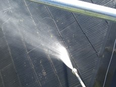 | 施工前の様子です。 | 屋根が酷く劣化していることが分かります。 | 近くで見ると所々剥げてしまっています。 |