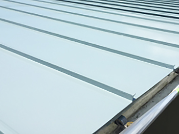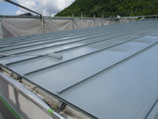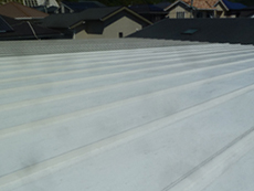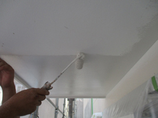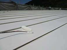 | 屋根の下塗りを行っている様子です。屋根は3回に分けて塗装します。 | 中塗りを終えた後、屋根の上塗りを行っている様子です。 |