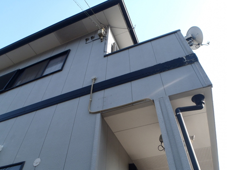 | 施工前の全体外観です。 | 帯が劣化しているのが見受けられます。帯、樋、軒天も塗装いたします。 |