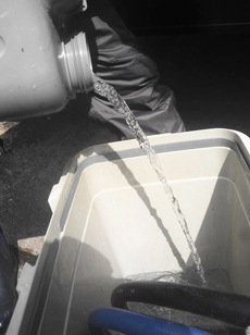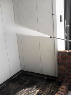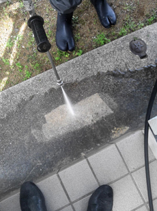 | 高圧バイオ洗浄に使用する洗浄液(オリバークリーナー)の準備中です。 | 屋根の高圧洗浄中です。 | 外壁の高圧洗浄中です。 |