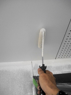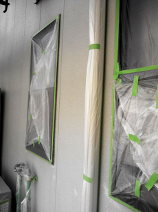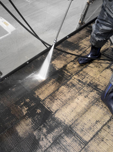 | 土間の高圧洗浄中です。 | 仮設足場設置の様子です。 | 開口部の養生の様子です。 |