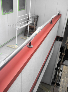 | 屋根の板金部錆止めが完了しました。 | ベランダのブリキ部分と帯の下塗り、錆止めが完了しました。 | マスキングをして溝以外のところにコーキング剤が付着しないようにします。 |
