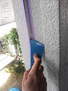 | コーキングを充填しているところです。 | コーキング剤をヘラで均していきます。 | コーキングが完了しました。 |