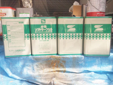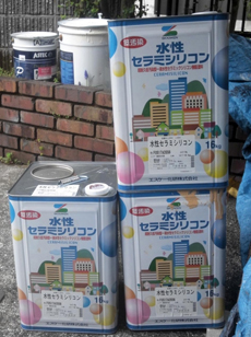 | 天井の上塗り中です。 | 外壁の上塗り材料です。 | 外壁の上塗り中です。 |