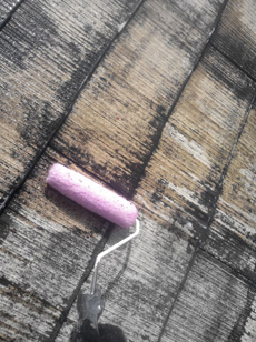 | 屋根の塗装に使う材料です | 屋根タスペーサーの取付作業です。雨漏り、野地板の腐食を防止します。 | 屋根の下塗り中です。 |