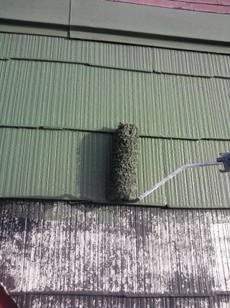 | 屋根の上塗り1回目の様子です。 | 屋根の上塗り2回目の様子です。 | 破風の上塗りをしている様子です。 |