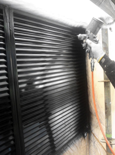 | 雨戸の上塗りをしている様子です。 | 樋を塗装している様子です。 |